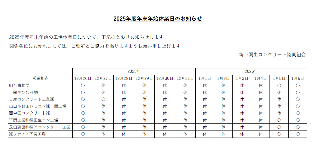 年末年始の工場休業日についてお知らせします。